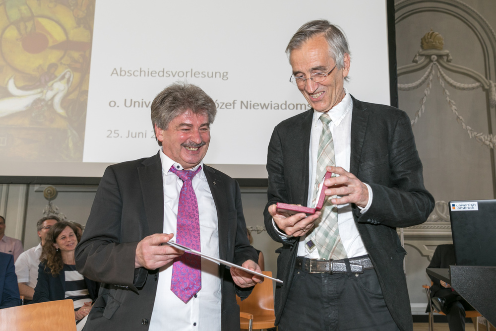 Mit einem Festakt aus Anlass seiner Emeritierung wurde am Dienstagabend an der Universität Innsbruck der Theologie-Professor Jozef Niewiadomski geehrt. Niewiadomski, der seit 1996 an der Katholisch-Theologischen Fakultät Dogmatik lehrte und ihr von 2004 bis 2013 als Dekan vorstand, zählt zu den einflussreichsten theologischen Persönlichkeiten des Landes. Unter anderem leitet er das international viel beachtete FWF-Forschungsprojekt "Raymund Schwager - Dramatische Theologie". Im Rahmen des Festaktes an der Universität Innsbruck wurde Niewiadomski u.a. von Universitäts-Rektor Tilmann Märk das "Österreichische Ehrenkreuz für Wissenschaft und Kunst 1. Klasse" überreicht.