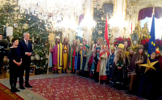 Bundespräsident Alexander Van der Bellen und seine Gattin Doris Schmidauer haben am Montag in der Wiener Hofburg Sternsingergruppen aus allen Bundesländern und deren Segenswünsche empfangen. Die verkleideten Könige Kaspar, Melchior und Balthasar seien "Botschafter der Humanität und Nächstenliebe", würdigte das Staatsoberhaupt den Einsatz der 85.000 Kinder, die derzeit im Rahmen der Dreikönigsaktion der Katholischen Jungschar österreichweit singend von Tür zu Tür unterwegs sind, um Häuser und ihre Bewohner zu segnen und Geld für Not leidende Menschen in Entwicklungsländern zu sammeln.