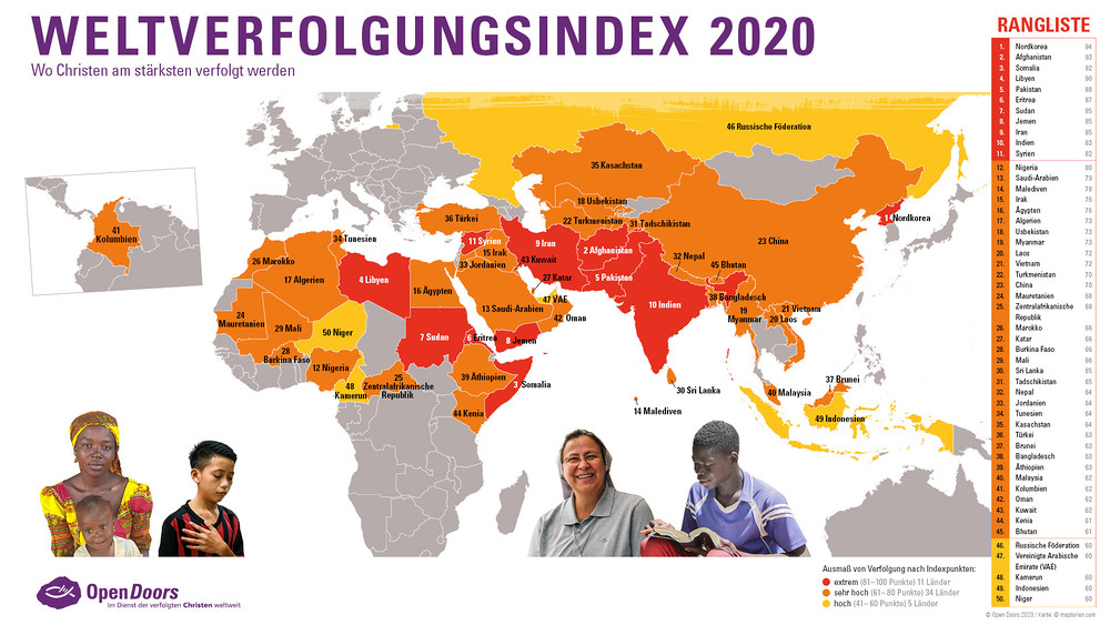Nordkorea führt die Liste seit Jahren an; dort müssen unter Machthaber Kim Jong-un laut "Open Doors" zehntausende Christen in Straflagern schwerste Zwangsarbeit leisten sowie Folter erleiden. Einheimische Christen in Afghanistan seien in ständiger Lebensgefahr, weil der Abfall vom Islam als todeswürdiges Vergehen gilt. Auch in Somalia könnten Christen ihren Glauben nur heimlich leben. Die Konflikte in Libyen erschwerten das Leben der wenigen Christen zusätzlich. Flüchtlinge, die über Libyen nach Europa fliehen wollen, würden schikaniert, gefoltert oder auch ermordet.