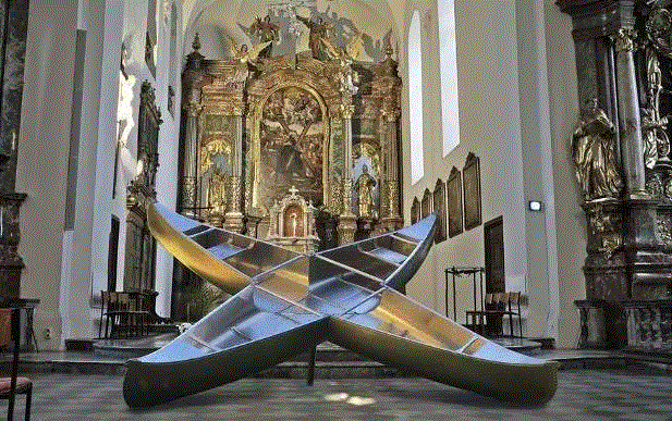 "Kreuzfahrt": Diesen doppelsinnigen Titel trägt eine Installation des steirischen Künstlers Erwin Lackner, die seit dem Aschermittwoch den Innenraum der Grazer St.-Andrä-Kirche dominiert: Zwei Kanus aus Aluminium sind zu einem griechischen Kreuz zusammenmontiert und machen "die Ausweglosigkeit derer sichtbar, die dieses Boot benutzen wollen", wie die Diözese Graz-Seckau auf ihrer Website zu dieser Fastenzeit-Initiative mitteilt. Mit der Boot-Metapher klingt die Flüchtlingsbewegung dabei ebenso an wie das mit einem Kreuzweg verbundene Leiden.