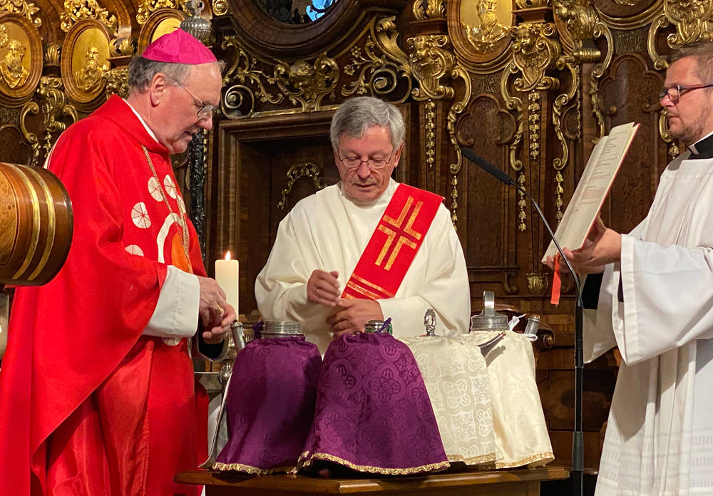 Bischof Alois Schwarz hat am Montag im Rahmen der Chrisammesse die Öle für die Sakramentenspendung geweiht. "Ich weihe heute erneut die Öle, damit ihr den Dienst an den Menschen wieder vollziehen könnt", sagte der St. Pöltner Bischof bei seiner Predigt im St. Pöltner Dom. Die heiligen Öle werden zur Spendung der Sakramente verwendet. Aufgrund der Corona-Präventionsmaßnahmen fand die Messe zu deren Weihe heuer nicht wie sonst am Vorabend des Gründonnerstags statt, sondern zum Hochfest Petrus und Paulus.