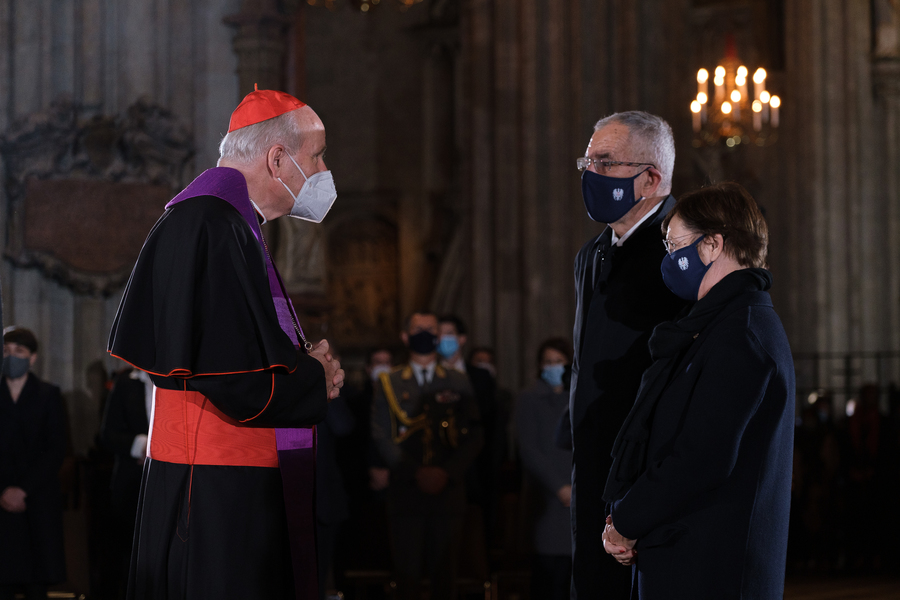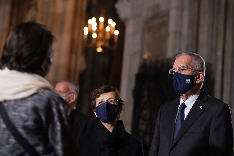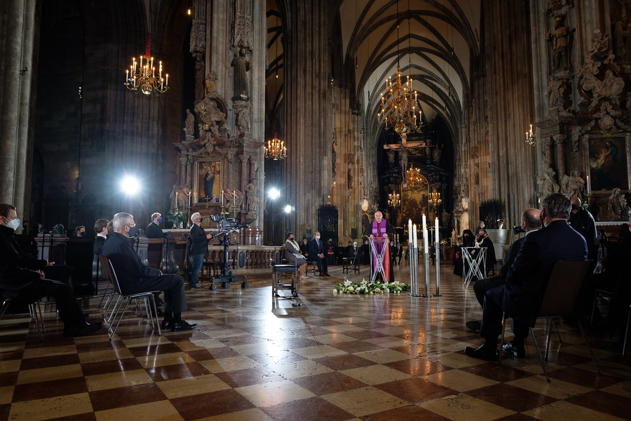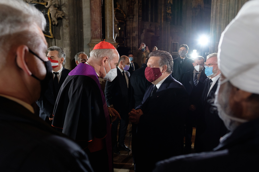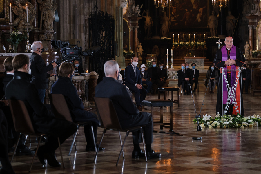 Mit einem Gedenk- und Trauergottesdienst im Wiener Stephansdom haben am Dienstagabend die führenden Vertreter der Kirchen und Religionsgemeinschaften sowie der Politik ihre Verbundenheit mit den Opfern des Terroranschlags von Montagabend aber auch untereinander bekundet. Dem Gottesdienst standen Kardinal Christoph Schönborn, der lutherischen Bischof Michael Chalupka, der orthodoxe Metropolit Arsenios (Kardamakis), der Präsident der Islamischen Glaubensgemeinschaft in Österreich, Ümit Vural, sowie die Vizepräsidentin der Israelitische Kultusgemeinde, Claudia Prutscher, vor. Die Vertreter der Kirchen und Religionen sprachen Gebete und entzündeten Kerzen für die beim Anschlag Getöteten.