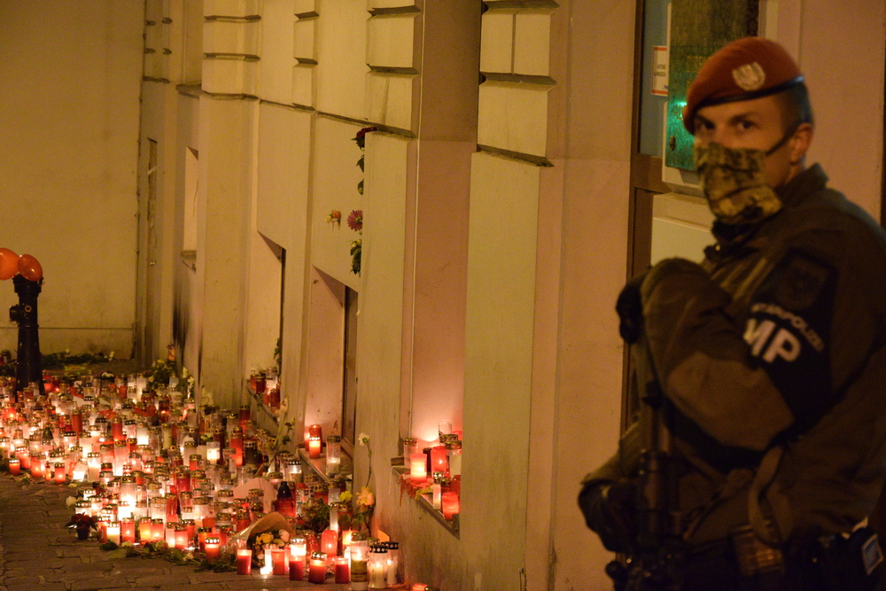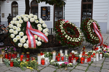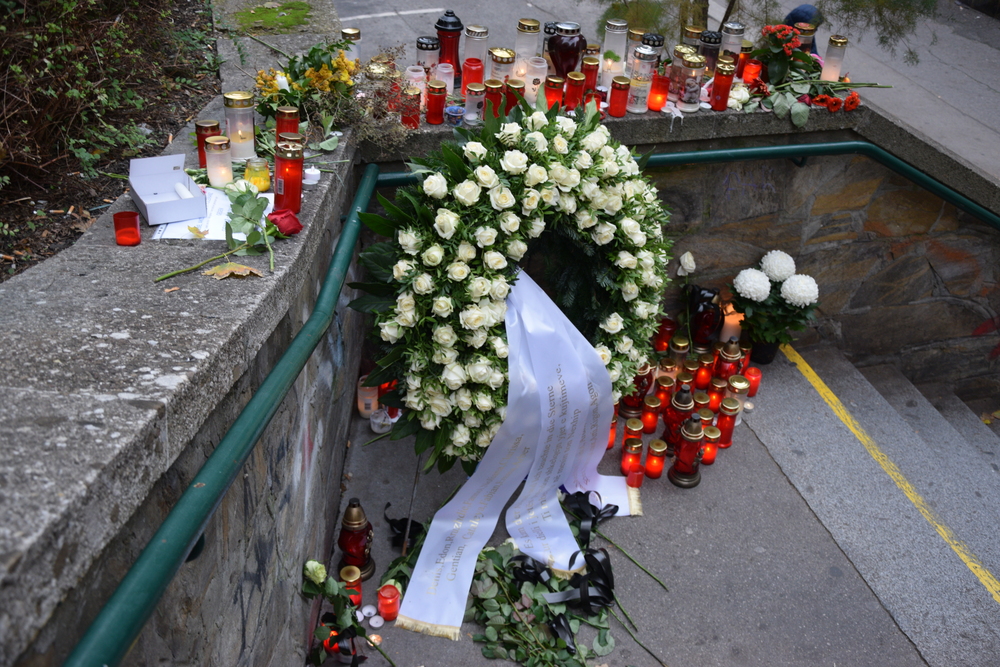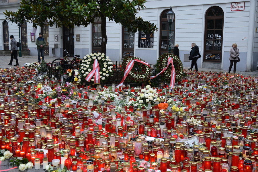 Ein Meer aus Kerzen, Blumen, Zeichnungen und Botschaften findet sich etwa am Desider-Friedmann-Platz. Bundespräsident Alexander Van der Bellen und die Regierungsspitze, aber auch Religionsvertreter haben dort am Tag nach dem Anschlag Kränze niedergelegt und der Opfer des Anschlags gedacht. Nicht nur hier, sondern überall dort, wo bei dem Terroranschlag ein Mensch ums Leben gebracht wurde, bleiben Passanten stehen, halten inne, machen Handyfotos. Manche Menschen bekreuzigen sich. Gesprochen wird kaum oder lediglich gedämpft.