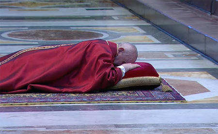 Zu Beginn entzündete Franziskus im Dunkeln die Osterkerze und folgte ihr in einer Prozession zum Kathedra-Altar. Während eines Gloria-Gesangs wurde die vatikanische Basilika nach und nach hell erleuchtet. Dazu stimmten Glocken des Gotteshauses Festgeläut an.