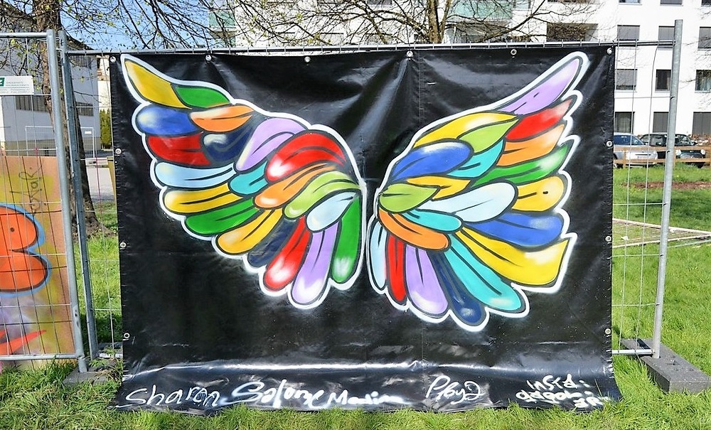 Farbenfrohe "Engelsflügel", als Graffiti auf Planen gesprayt, kennt man auch aus Großstädten wie Berlin oder Barcelona. In Städten und Pfarrgemeinden Vorarlbergs sollen diese von Jugendlichen der Offenen Jugendarbeit Dornbirn (OJAD) gestalteten Blickfänge ausgeliehen werden und als Anstoß "für spannende Gespräche und ein absoluter Foto-Hotspot" fungieren. "Wo lässt es sich besser über z. B. Schutzengel ins Gespräch kommen, als vor farbigen Flügeln?", lautet die rhetorische Frage auf der Website der Diözese Feldkirch.