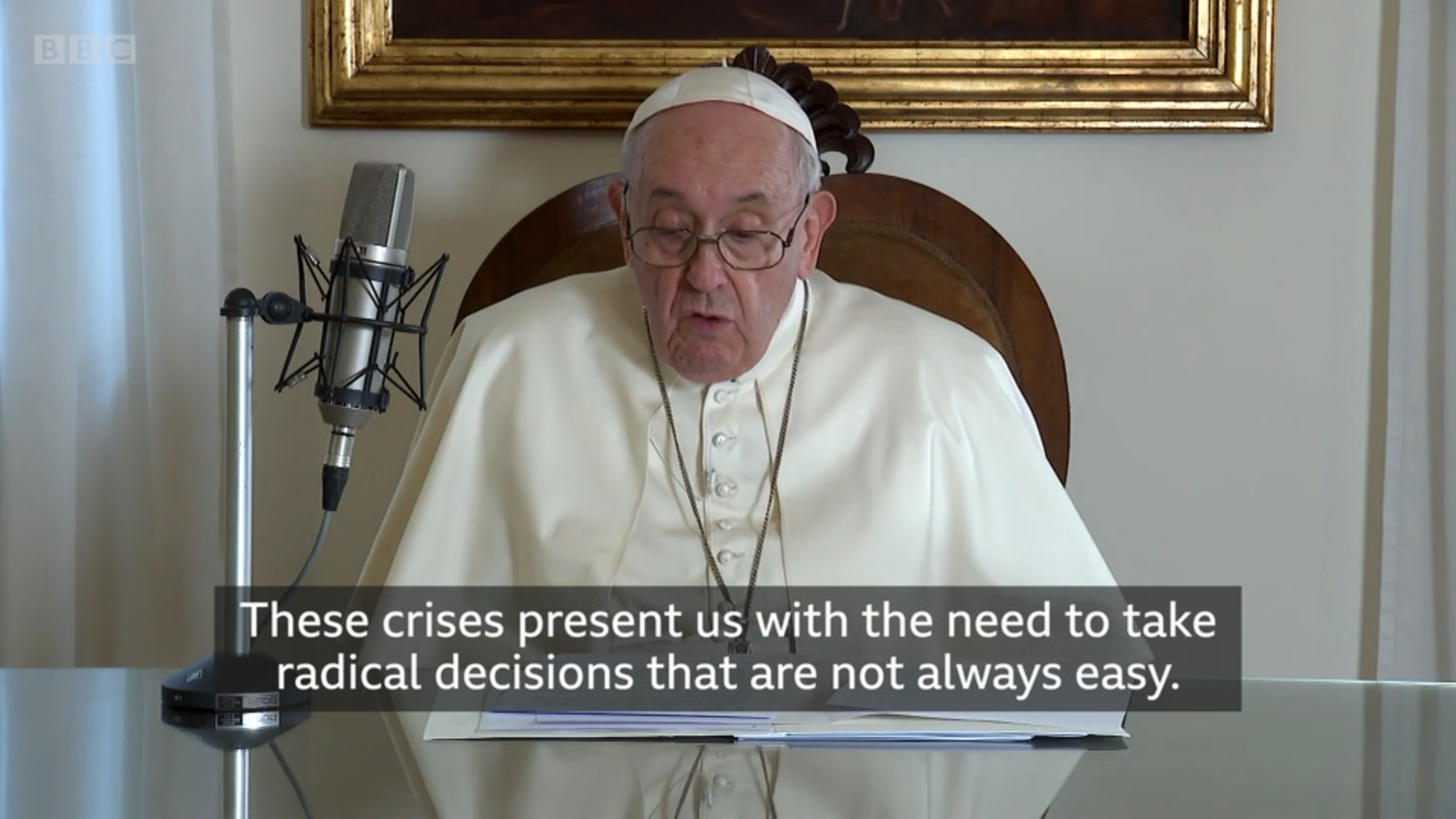 "All diese Krisen sind tief miteinander verbunden." Und sie erforderten radikale Entscheidungen, die nicht immer einfach seien, fügte er hinzu. Gleichzeitig schafften die Krisen aber auch Möglichkeiten, die man nicht verstreichen lassen dürfe. Notwendig sei ein gemeinsamer neuer Verantwortungssinn für die Welt. "Wir alle wissen, wir kommen aus einer Krise nie alleine ohne andere heraus", mahnte der 84-Jährige in der knapp fünf minütigen Ansprache.