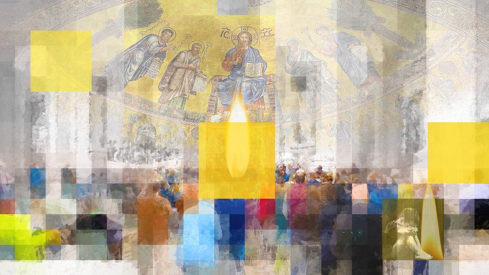 Das "Pfingsten-Tuch 2022" greife auf das Bildprogramm des diesjährigen Fastentuches zurück. Wahrend der Wandlung vom grauen Beginn hin zum goldgelben Licht tauchen immer wieder Bildfragmente vom Fastentuch auf, Bilder vom Leid durch Begegnungslosigkeit, Entfremdung, Missbrauch. Dieses Leiden verblasse im Licht des Heiligen Geistes. "Auch in unserem Leben?", so die Frage des Künstlers.