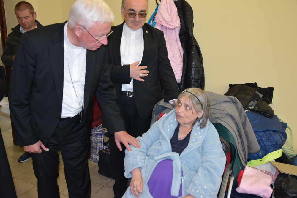 Die ersten Flüchtlinge waren bereits einen Tag nach Beginn der Kämpfe in Lemberg angekommen. Zigtausenden Flüchtlingen und Menschen in Not hat die Pfarre seither helfen können. Aktuell leben 150 Flüchtlinge, davon rund die Hälfte Kinder, in dem Pfarrzentrum. Mitglieder der Pfarrgemeinde haben Matratzen, Bettzeug und Lebensmittel zusammengetragen und versorgen die Menschen. Menschen aus Kiew, Schytomyr, Saporischschja und vielen anderen Orten der Ukraine haben in der Pfarre ein Obdach gefunden. Die beiden Bischöfe wurden von den Kindern mit Schildern begrüßt, auf denen ihre Heimatstadt geschrieben stand.