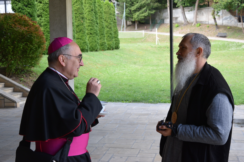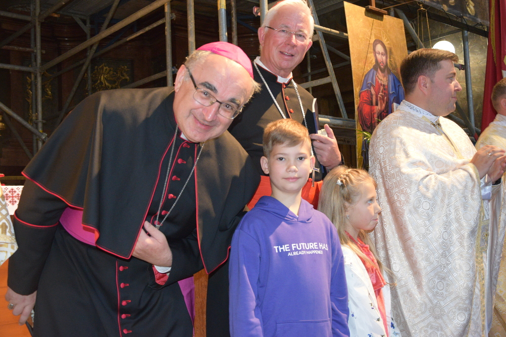 Vor dem mittäglichen Gottesdienst im Zentrum von Lemberg waren die Bischöfe aus Österreich in der römisch-katholischen Pfarre Sankt Johannes Paul II. am Stadtrand von Lemberg zu Gast. In einem Zentrum der Pfarre werden seit dem ersten Tag des Krieges Flüchtlinge betreut, wie Erzbischof Mokrzycki berichtete.