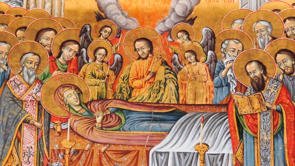 Die Unterschiede in der katholischen und orthodoxen Akzentsetzung zum Marienfest am 15. August werden auch in der Kunst deutlich. Während in der westlichen Tradition die (triumphale) leibliche Aufnahme (Himmelfahrt) Marias in den Himmel dominiert, ist auf den orthodoxen Ikonen die von den Aposteln umgebene Maria auf dem Sterbebett zu sehen. Dahinter befindet sich Christus, der die Seele seiner Mutter empfängt.