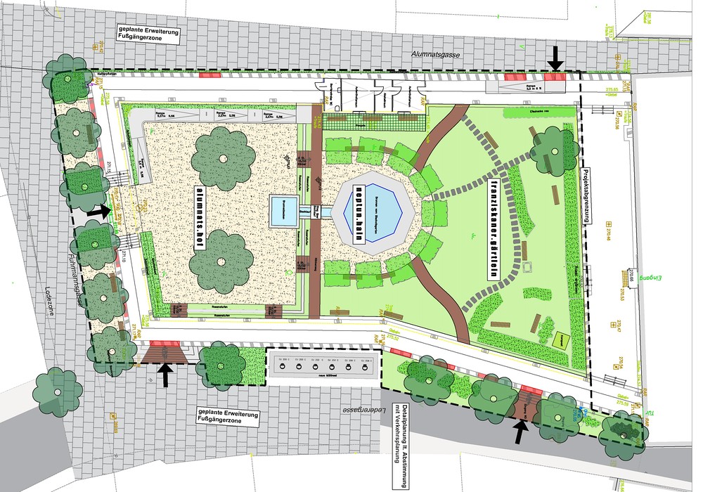 Unterteilt werden soll der neue Park in drei Bereiche - von einem arenaförmigen und öffentlichen Raum hin zu einem, dem historischen Standort entsprechenden, klosterartigen Blumengarten: in den 520 Quadratmeter großen Alumnatshof mit Hauptzugang von Süden, den 360 Quadratmeter großen Neptun-Hain mit Brunnen und in das knapp 500 Quadratmeter große Franziskanergärtlein mit Blumenwiese und Rasenfläche.