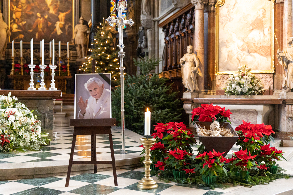 Benedikt XVI./Joseph Ratzinger war am 31. Dezember im Alter von 95 Jahren im vatikanischen Kloster Mater Ecclesiae gestorben, wo er seit seinem freiwilligen Amtsverzicht 2013 wohnte. Am Stephansdom ist seit dem Silvestertag eine Trauerbeflaggung in Form einer 18 Meter lange Fahne in den Kirchenfarben Gelb-Weiß samt eines sechs Meter langen Trauerflors angebracht. Im Dom ist auch ein Kondolenzbuch aufgelegt, in das sich die Gläubigen eintragen können.