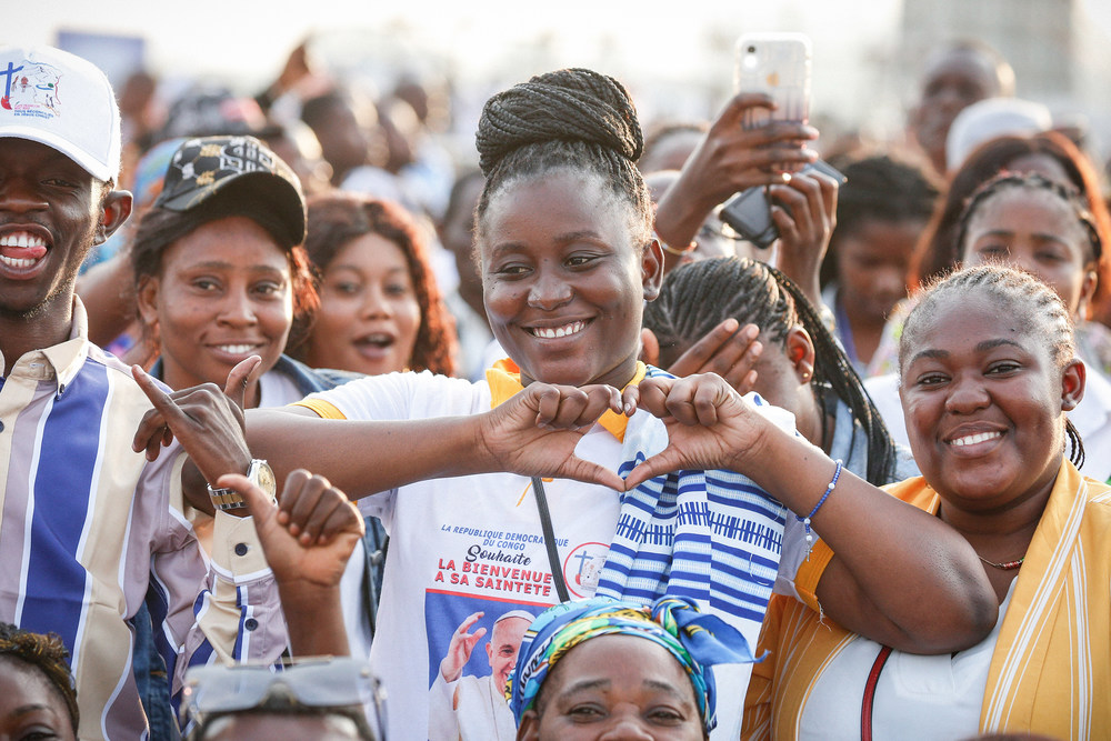 Am Mittwoch sind es nicht die Autoritäten des Landes, sondern Pfadfinder, Kommunionkinder, Chöre, Familien oder Mitglieder von Pfarrgemeinden, die schon früh über die chaotischen Straßen Kinshasas zur Papstmesse pilgern. Frauen balancieren riesige Tüten mit Popcorn oder Wasserflaschen auf ihren Köpfen. Ein kleiner Markt am Straßenrand bietet neben Brot und Getränken auch Devotionalien aller Art. Im Staub und Rauch von verbranntem Müll blickt Franziskus gütig lächelnd von oben, unten und auf Augenhöhe auf das Treiben.