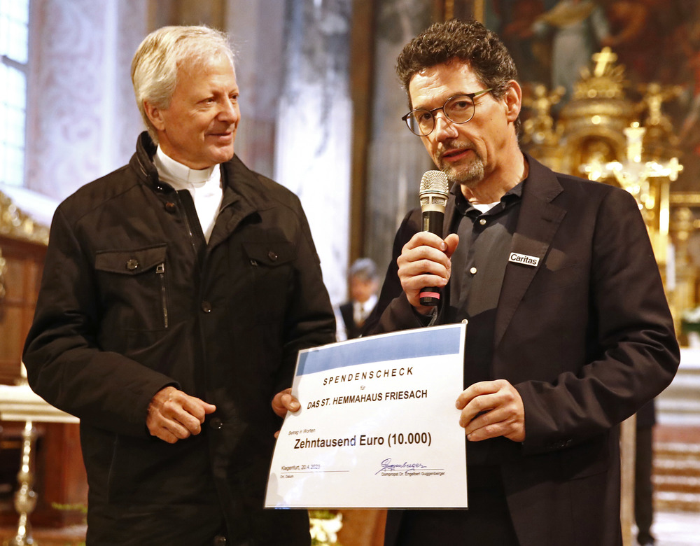 Es sei dem Domkapitel ein besonderes Anliegen, im Sinne von gelebter Gottes- und Nächstenliebe anlässlich des 900-Jahr-Jubiläums ein doppeltes Sozialprojekt zu stiften. So überreichte Guggenberger am Ende des Festaktes an Caritasdirektor Ernst Sandriesser einen Scheck in Höhe von 10.000 Euro für das St. Hemma-Haus der Caritas in Friesach.