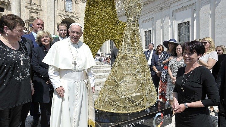 Initiiert hatte die Aufstellung der Statue der Verein "RollOn Austria", der die Anliegen und Interessen körper- und mehrfachbehinderter Menschen vertritt. Eine Pilgergruppe des Vereins hatte Papst Franziskus bei einer Generalaudienz im Juni 2019 persönlich begrüßt. Als Zeichen für den Schutz und die Wertschätzung des behinderten Lebens brachte die Gruppe die 2,30 Meter große Engelsskulptur mit dem gebrochenen Flügel mit. Papst Franziskus segnete das Denkmal, das fortan den Domplatz in Feldkirch schmückt.