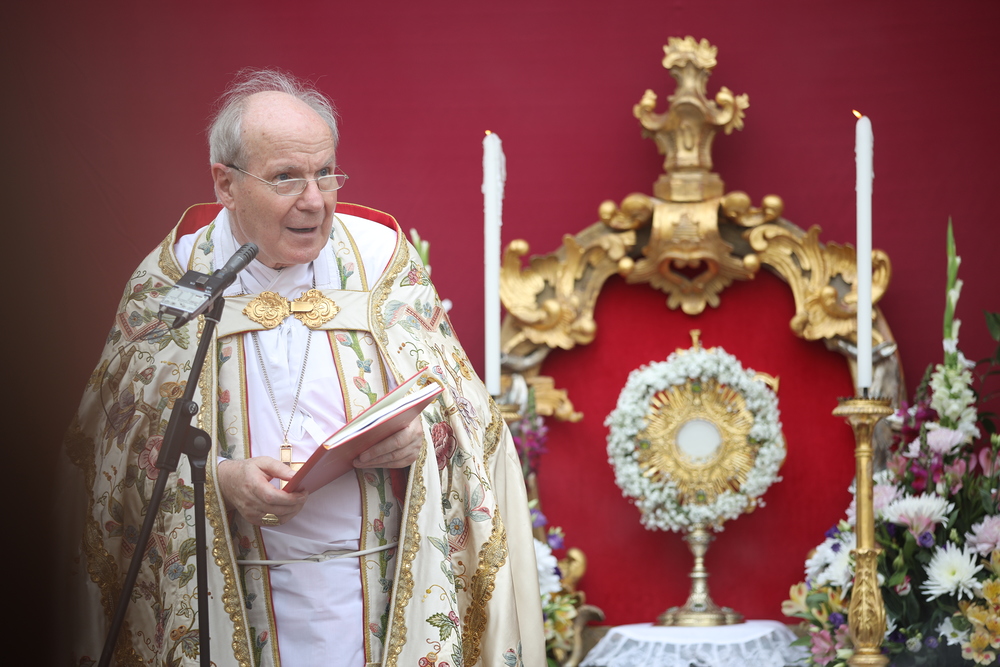 Die Religion sah der Salzburger Erzbischof stets in Gefahr, "dass die bloße Gesetzlichkeit und Regelhaftigkeit zu sehr überhandnimmt", während das Geistig-Geistliche zu kurz komme. Wachsamkeit sei vonnöten, damit der Glaube nicht von Einzelinteressen instrumentalisiert werde - und zwar heute eher von Akteuren innerhalb als von außerhalb der Kirche. Um den geforderten "Balanceakt zwischen Dogmatismus, Doktrin und Beliebigkeit" zu meistern, sei es wichtig, dass Christen Akzente setzten - wie eben zu Fronleichnam. An diesem Fest würden "mit dem Kostbarsten, das uns gegeben ist" - der Eucharistie - das Land mit seinen Menschen gesegnet.