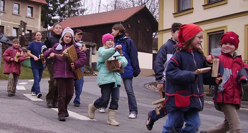Wenn in der Karwoche die Kirchenglocken verstummen, übernehmen hölzerne Ratschen laut und kantternd ihren Part: Mit dem Gloria am Gründonnerstag beginnt das sogenannte Triduum sacrum, und damit auch der jahrhundertealte Brauch des Ratschengehens. In dieser Zeit verstummen Glocken und Orgeln als Zeichen der Stille und Trauer und fliegen - wie es im Volksmund heißt - nach Rom. An ihre Stelle treten Ratschen, mit denen Kinder und Jugendliche an die Gebetszeiten und Gottesdienste erinnern oder Sprüche aufsagen. Der jahrhundertealte Brauch ist als immaterielles Kulturerbe anerkannt. In vielen Pfarren bitten die Kinder um eine "Ratschenspende", traditionell in Form von Ostereiern, heute meist in Form von Geld oder Süßigkeiten.