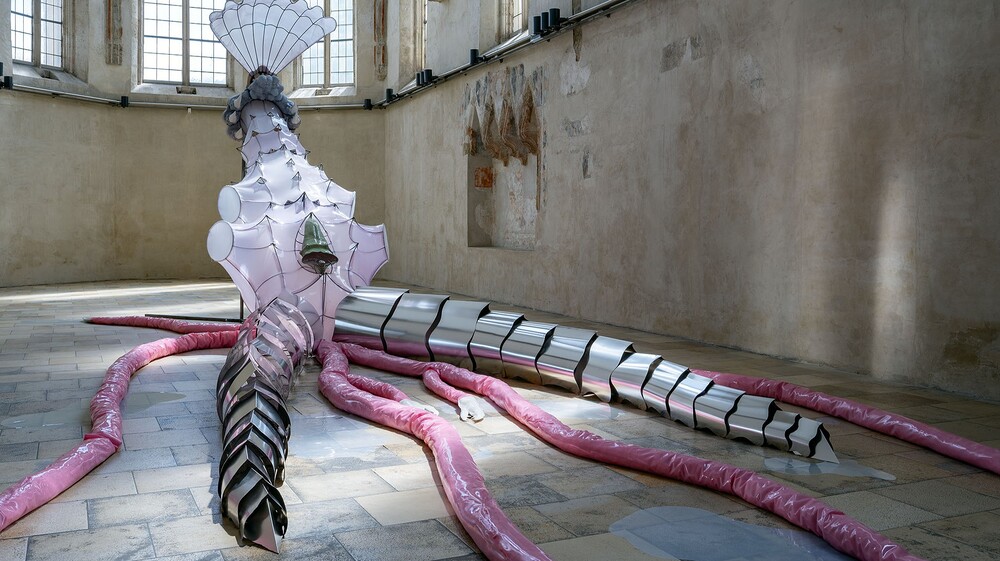 Ein geheimnisvolles, organisches Wesen, gefertigt aus Eisen, Porzellan und Wachs sowie Silikon und Latex, schlängelt sich über den Chorraum, begleitet von Lustern aus Porzellan und Wachs, die sakrale Symbole mit queerer Opulenz aufladen. Belova setze mit der Verknüpfung von barocker Ästhetik mit feministischer bzw. queerer Kritik ein selbstbewusstes Statement für Körperlichkeit, Lust und Sichtbarkeit, hieß es.