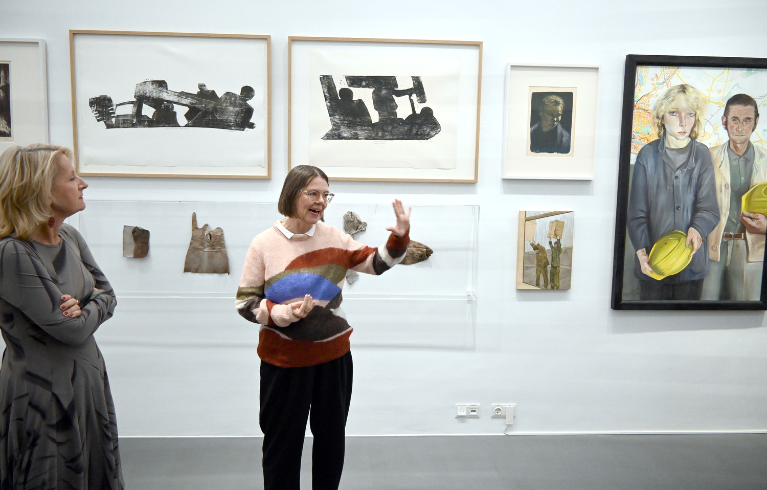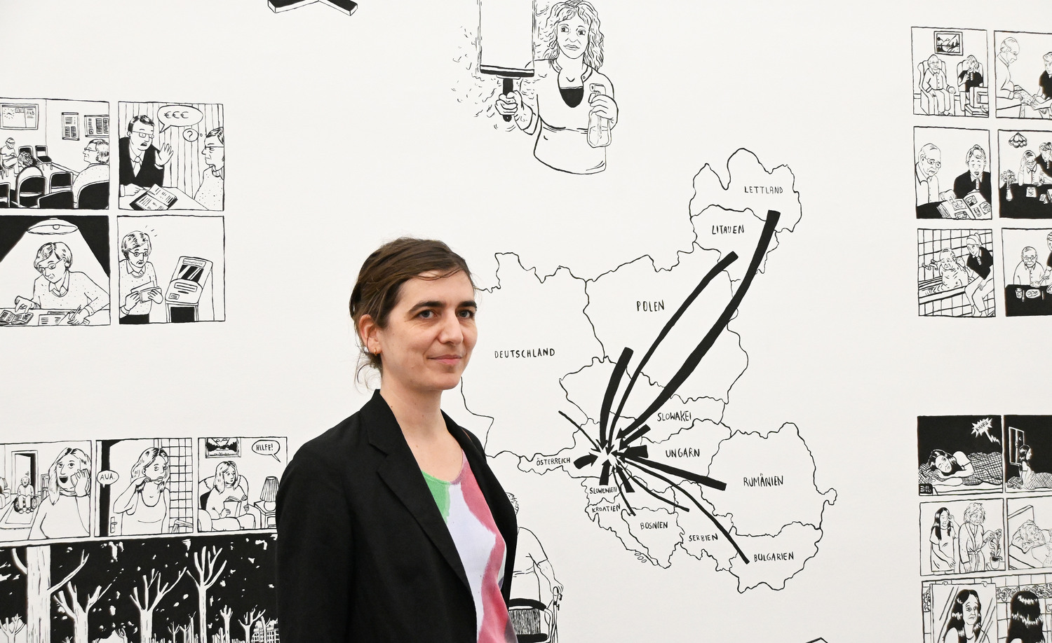 Mehrere Arbeiten widmen sich unter dem Titel "Unverzichtbar, unsichtbar" der Pflegearbeit und schlecht bezahlten Tätigkeiten im Hintergrund. Die Zeichnerin Tine Fetz zeigt in ihrem Wandbild "Hilfslinien" den Alltag von Pflegekräften in Österreich. Grundlage dafür waren Interviews mit Betroffenen. Themen sind Sprachbarrieren, rechtliche Unsicherheiten, Arbeitsbedingungen und geringe Bezahlung.