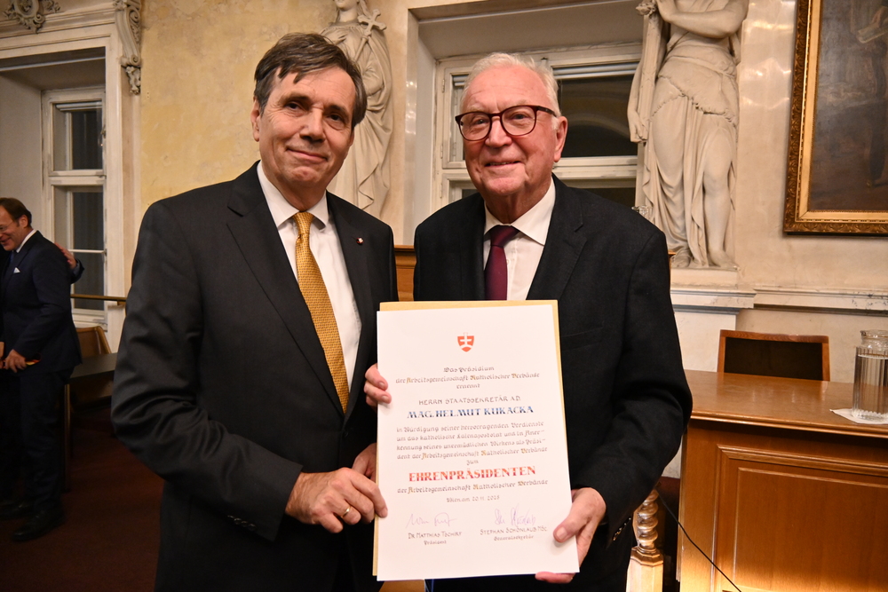Mit der Ehrenpräsidentschaft für Kukacka hat die AKV ihren früheren Präsidenten geehrt, der in mehrfacher Weise das Verbandswesen nachhaltig geprägt habe, wie Tschirf über seinen Amtsvorgänger ausführte. Neben der fundierten Erinnerung und Aufarbeitung des christlichen Widerstands in der NS-Zeit habe sich Kukacka nicht nur in Wort, sondern mit zahlreichen konkreten Initiativen für verfolgte Christen vor allem im Nahen und Mittleren Osten eingesetzt.