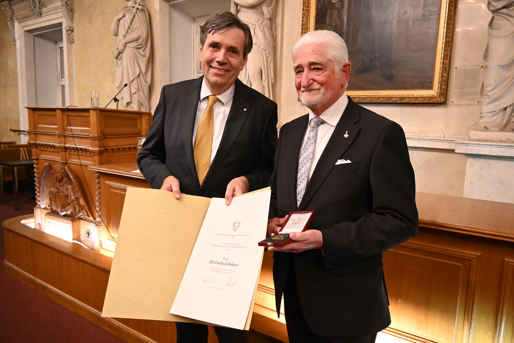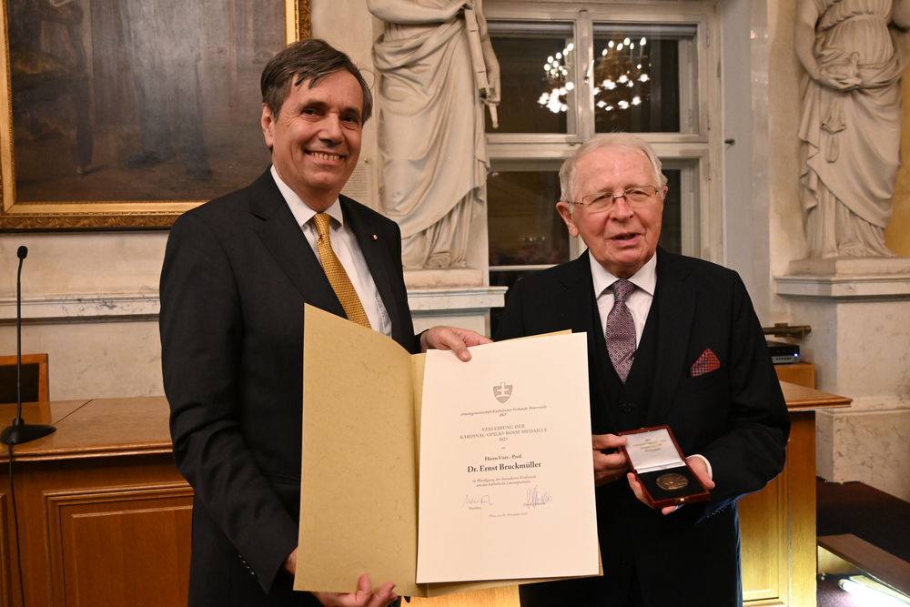 Als Experte für die "österreichische Identität" wurde der emeritierte Professor für Wirtschafts- und Sozialgeschichte an der Universität Wien, Univ.-Prof. Ernst Bruckmüller, von der AKV mit der Kardinal-Opilio-Rossi-Medaille gewürdigt. Das Mitglied der Österreichischen Akademie der Wissenschaften hat sich mit über 300 Veröffentlichungen zu Sozialgeschichte, Bürgertum, Agrargeschichte sowie Nationalbewusstsein und Nationsbildung einen Namen gemacht.