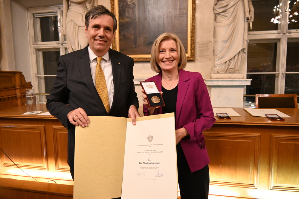 Die Journalistin und Kurier-Herausgeberin Martina Salomon ist von der Arbeitsgemeinschaft Katholischer Verbände (AKV) mit der Kardinal-Opilio-Rossi-Medaille ausgezeichnet worden. Neben Salomon erhielten auch der Historiker Prof. Ernst Bruckmüller sowie Friedrich Birkner am Donnerstagabend im Alten Rathaus in Wien die "höchste Auszeichnung", die vom katholischen Verbandswesen seit nunmehr 40 Jahren vergebe wird, wie AKV-Präsident Matthias Tschirf betonte. Im Rahmen des Festakts wurde zudem die AKV-Ehrenpräsidentschaft an Helmut Kukacka, Staatssekretär a.D., verliehen.