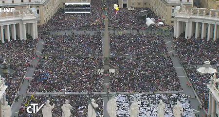 Ein Million Menschen nehmen nach Angaben der römischen Quästur an der Heiligsprechung der beiden Päpste Johannes XXIII. und Johannes Paul II. teil. Das meldete das staatliche italienische Fernsehen an Sonntag kurz vor Beginn der feierlichen Messe. Nicht nur der Petersplatz selbst ist längst gefüllt, auch auf der anschließenden breiten Via della Conciliazione zur Engelsburg und zu den Tiberbrücken drängen sich die Menschen so, dass es kein Durchkommen mehr gibt.