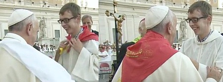 Die Teilnehmer des Treffens des internationalen Ministranten-Verbundes CIM kamen in bunten Halstüchern auf den Petersplatz - je Land in einer anderen Farbe. Ein ukrainischer Ministrant überreichte Franziskus zu Beginn der Feier das einzige weiße Halstuch. Gegen Ende schenkte ein Jugendlicher aus Österreich sein eigenes rotes Halsbund dem Papst, der es sich auch mit einem Lachen bereitwillig umbinden ließ. Aufgrund der vielen Österreicher sprach der Papst mehrere Feiertexte auf Deutsch, etwa in seinem Verweis etwa auf die Heiligen Franz von Assisi, Maria und Johannes Maria Vianney sowie in der Einleitung des gemeinsamen Vaterunser-Gebetes.