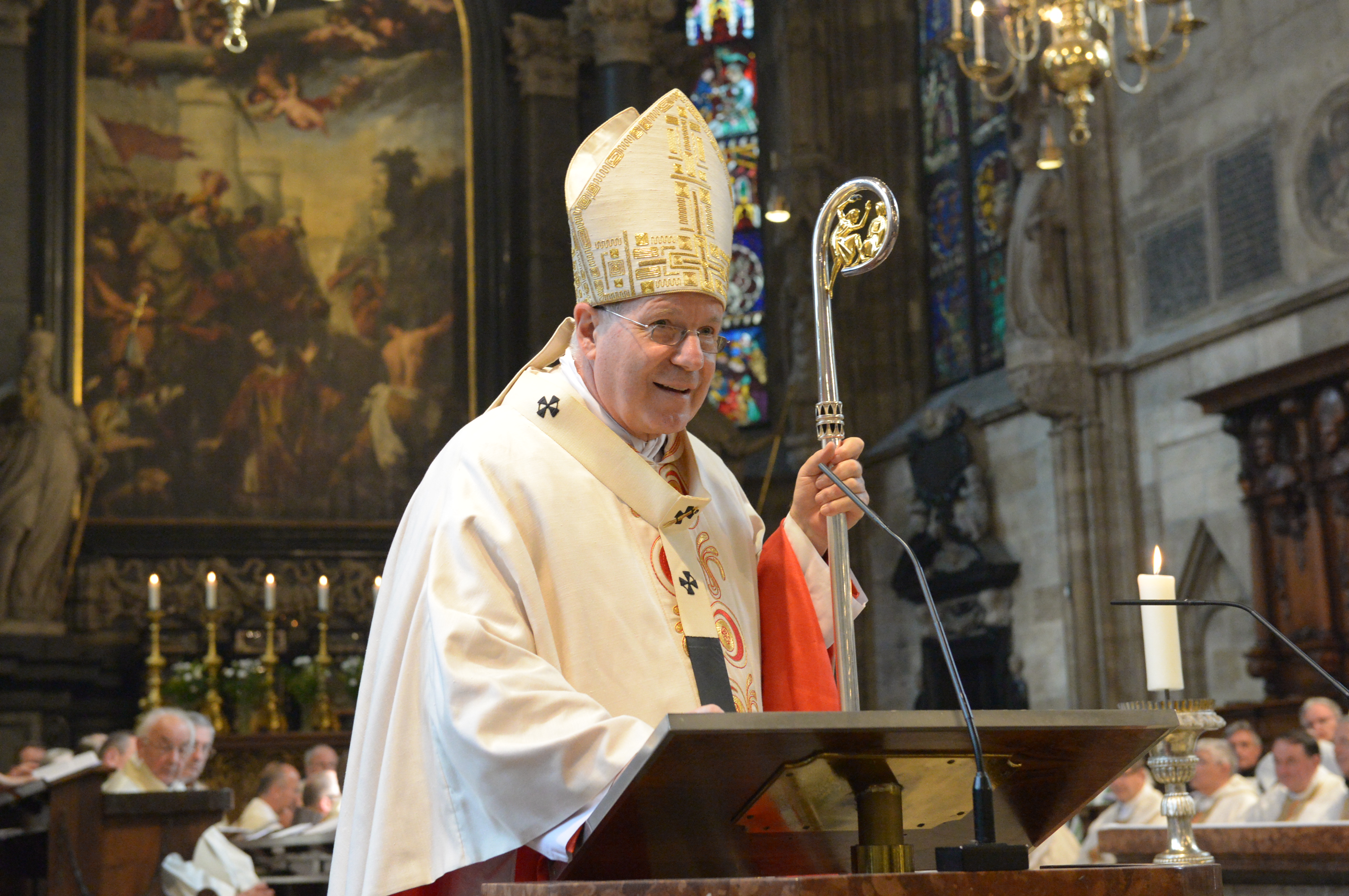Ganz im Zeichen der Flüchtlingskrise steht die Feier zum 20-Jahr-Jubiläum von Christoph Schönborn als Wiener Erzbischof. Die heutige Situation sei ein "Anzeichen für einen Epochenwandel", erklärt der Kardinal im Stephansdom vor rund 4.000 Gläubigen. Die Kirche müsse die Zeichen der Zeit richtig deuten, sich der "Dringlichkeit" der Realität stellen und die Flüchtlingsfrage zuvorderst als eine Frage der Menschlichkeit sehen.