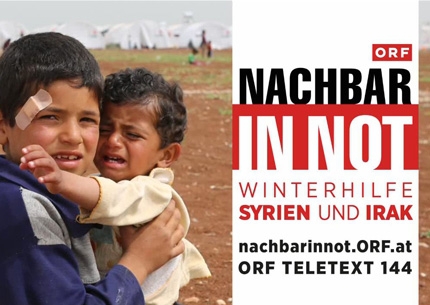 "Nachbar in Not" wirbt mit Aufrufen in Fernsehen und Radio sowie mit Berichterstattung in allen ORF-Medien und -Landesstudios um Spenden. Seit dem Start der Syrien-Kampagne im Mai 2013 hat die Hilfsaktion 11,5 Millionen Euro gesammelt. (Infos: Nachbar in Not-Flüchtlingshilfe Syrien, Spendenkonto: IBAN: AT05 2011 1400 4004 4000, BIC: GIBAATWWXXX, Online-Spenden unter http://nachbarinnot.ORF.at)