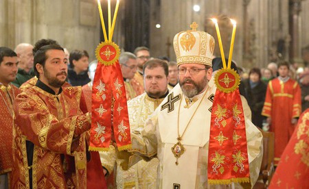 Im Zeichen des Gebets um Frieden in der Welt stand am Samstagabend eine byzantinische Göttliche Liturgie im Wiener Stephansdom, der der ukrainische Großerzbischof Swjatoslaw Schewtschuk und Kardinal Christoph Schönborn vorstanden. "Wir beten um Frieden in Syrien und wir beten um Frieden in der Ukraine, wo heute wie vor 100 Jahren Blut vergossen wird", sagte Großerzbischof Schewtschuk wörtlich.