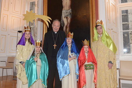 Mit einem Besuch bei Kardinal Christoph Schönborn ist die Dreikönigsaktion am Dienstag in die 63. Auflage des Sternsinger-Zuges gestartet. Stellvertretend für die rund 85.000 Sternsinger in ganz Österreich brachten vier Kinder aus der Pfarre Kaisermühlen am Dienstag Schönborn den Weihnachtssegen ins Erzbischöfliche Palais. Bis zum 6. Jänner werden zehntausende Mädchen und Buben von Haus zu Haus ziehen, singen, Neujahrswünsche überbringen und für Not leidende Menschen in Entwicklungsländern sammeln.