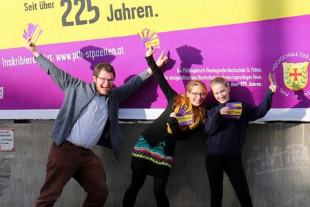 Die Philosophisch-Theologische Hochschule St. Pölten wirbt mit einer Plakat-Kampagne um neue Studenten. Auffallende Begriffspaare auf Großplakaten, wie etwa "Suche.Wahrheit" oder "Erforsche.Gott" sind derzeit in Niederösterreich und in Wien zu finden. Die Hochschule wolle "das theologische Herz der Diözese sein und immer mehr werden", so Rektor Reinhard Knittel über die beabsichtigte Botschaft der Kampagne, die ein "kommunikativer Anker" für die Zielgruppe sein soll. Unterstützt wird die Kampagne auch mit Flyern in öffentlichen Verkehrsmitteln.