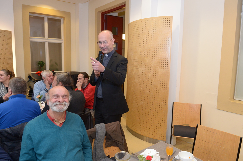 Das Spanferkel-Festessen fand in den zentralen Räumlichkeiten des Curhauses - dem Stephaniesaal und angrenzenden Räumen - statt. Begrüßt wurden die rund 250 Gäste von Dompfarrer Toni Faber persönlich. "Das persönliche Willkommen und die damit ausgedrückte Wertschätzung ist für viele das wichtigste", weiß Faber zu berichten. Auch die Tatsache, dass sich das Angebot ausdrücklich nicht als Armenausspeisung, sondern als Festessen versteht, solle diese Wertschätzung zum Ausdruck kommen. Zugleich verwies Faber auf die vielfältigen, ganzjährigen Sozial- und Fürsorgeangebote, die die Dompfarre mache: Eigene Sozialarbeiter würden sich das ganze Jahr über um Menschen im Umfeld der Dompfarre kümmern und sie versorgen.