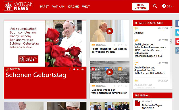 Die neue Nachrichten-Website des Vatikan ist seit dem späten Samstagnachmittag online. Unter der Adresse www.vaticannews.va; sind in sechs Sprachen Nachrichten und andere Informationen rund um Papst und Vatikan verfügbar. Das Portal ist eines der bisher augenfälligsten Ergebnisse der Kurienreform von Papst Franziskus im Medienbereich. Noch handelt es sich bei dem Portal um eine Beta-Version, doch die Nachrichten sind bereits aktuell.