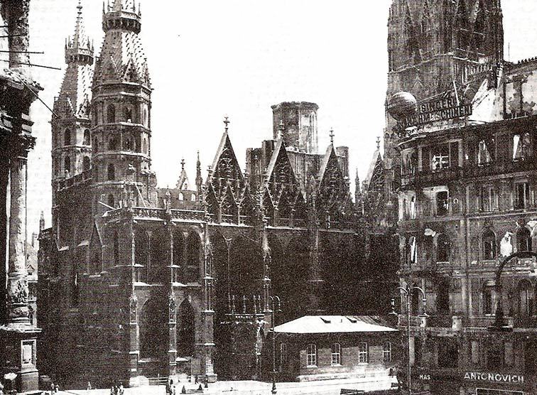 Am 12. April 1945 stürzte die Pummerin, die größte Glocke des Stephansdoms, als Folge eines Dachbrandes in die Turmhalle herab und zerbrach. Tags darauf durchschlug eine einbrechende Stützmauer das Gewölbe des südlichen Seitenchors, das in den Dom eindringende Feuer zerstörte Chorgestühl und Chororgel, Kaiseroratorium und Lettnerkreuz. Der Stephansdom bot ein erbarmungswürdiges Bild sinnloser Zerstörung.