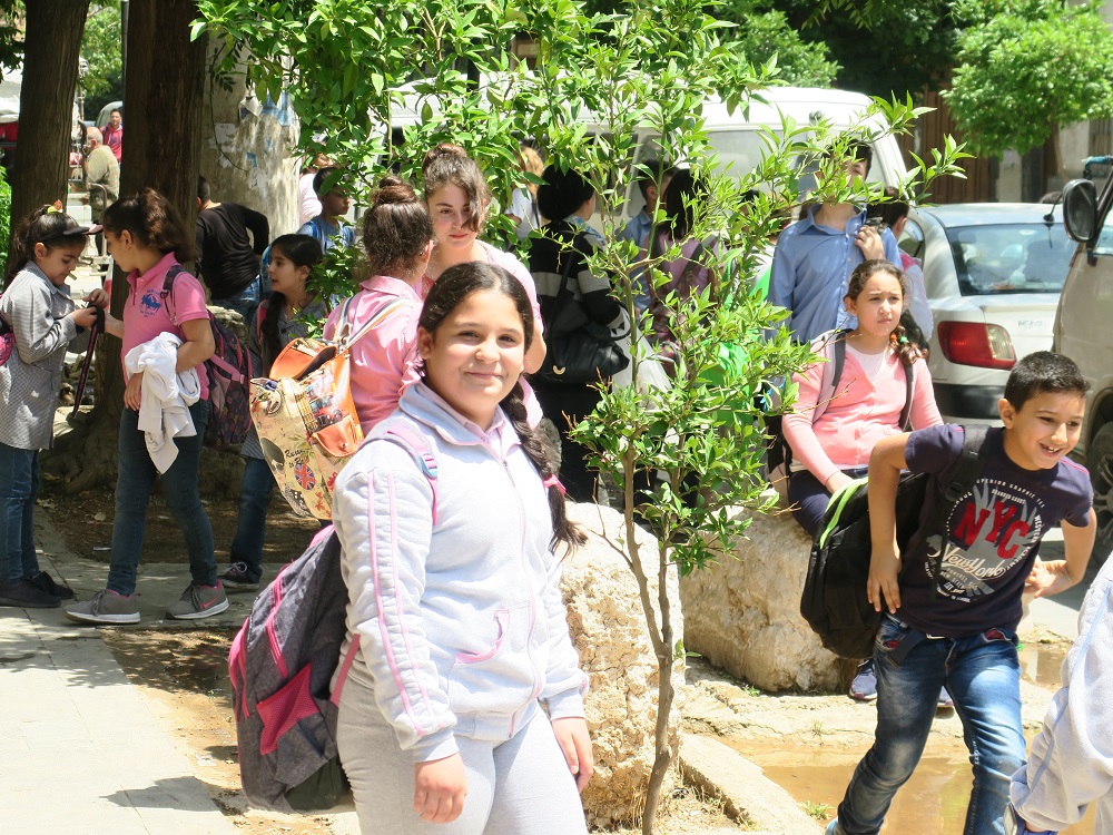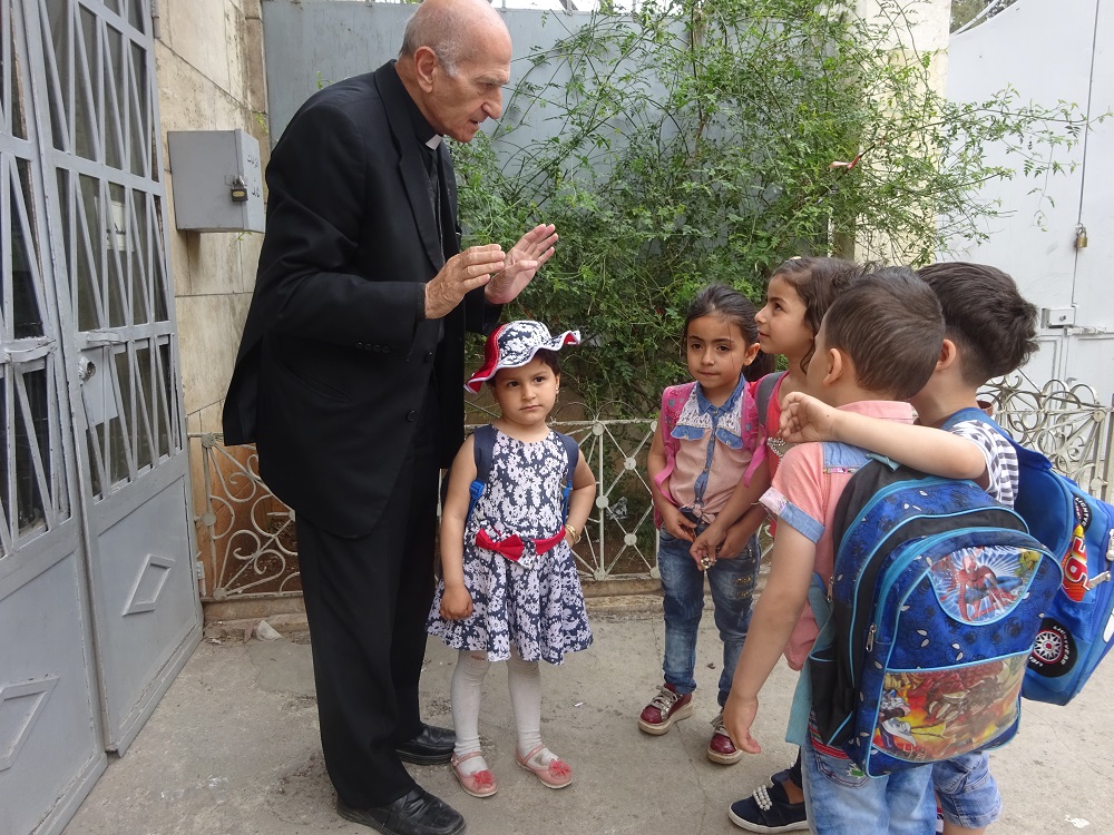 Unser nächster Besuch gilt der melkitischen Kirche in Aleppo. Wir besuchen P. George Jamous. Er leitet einen Kindergarten und eine Schule für 650 Kinder. Gut 30 Prozent davon sind Muslime. Eine Herausforderung ist es für den Schulleiter, seine Lehrer zu halten. Deren Gehalt ist sehr gering und bewegt sich zwischen 30.000 (60 Euro) und 60.000 (120 Euro) syrische Lira. Da ist es kein Wunder, dass schon einige die Auswanderung gewählt haben. (Zum Vergleich: Das Taxi für die Fahrt von Aleppo nach Damaskus am nächsten Tag kostet uns 90 Euro.) Die Schule auch dringend eine Renovierung notwendig. Doch dafür fehlt das Geld.