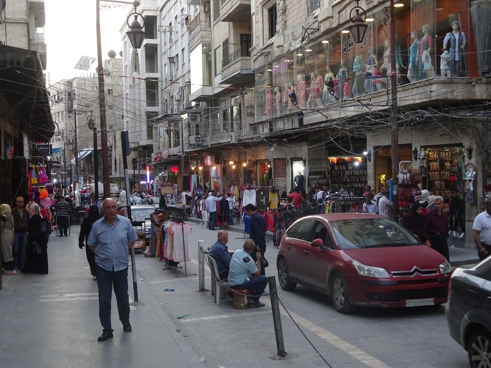 Doch das ist nur die halbe Wahrheit über Aleppo: Keine hundert Meter weiter finden wir eine andere Stadt vor: Pulsierende Geschäftsstraßen, volle Straßenläden, flanierende Menschenmassen, volle Cafes und Restaurants – und das obligatorische Verkehrschaos samt enervierendem Gehupe. Unser Begleiter P. Hanna zeigt sich positiv überrascht. Bei seinem letzten Besuch in Aleppo vor einigen Monaten hätte es noch viel weniger offene Geschäfte gegeben, erzählt er.