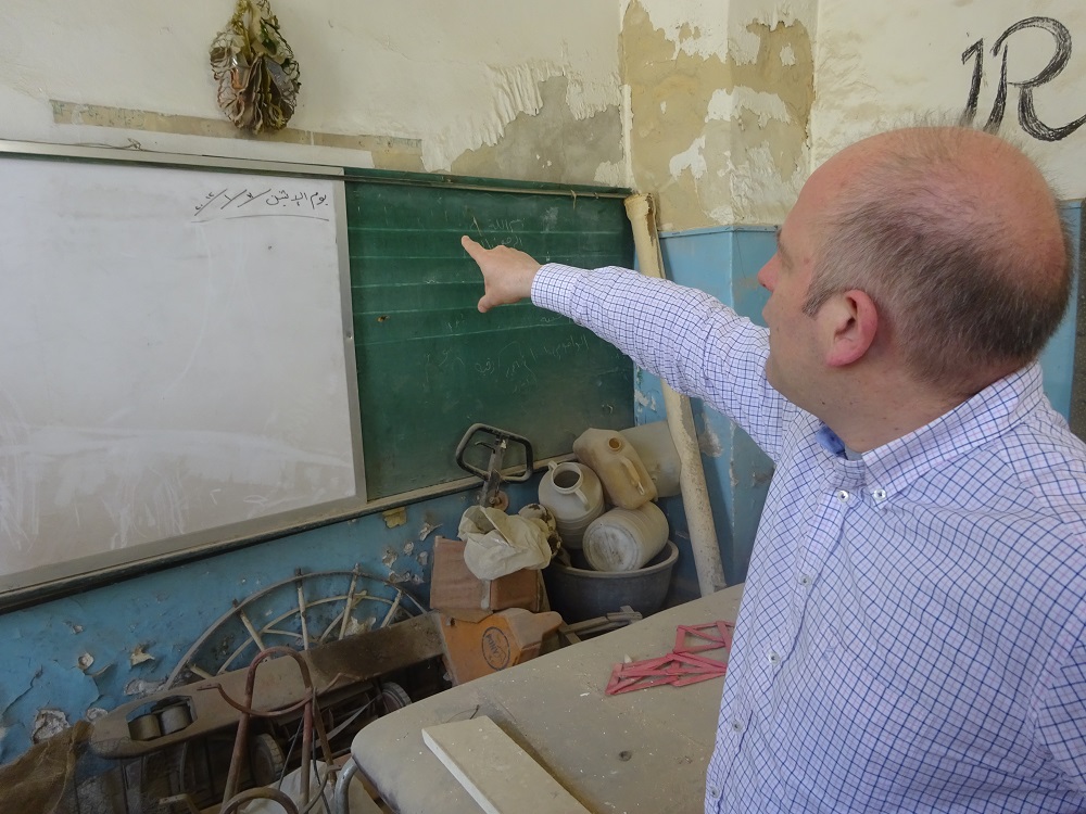Zum Kloster gehört eigentlich auch eine Schule. Genau genommen sind es sogar zwei. Nur sind die Räumlichkeiten völlig zerstört. An eine Wiederaufnahme des Schulbetriebs ist derzeit nicht zu denken. P. Andrew, ein gebürtiger Pole, führt uns durch die Ruinen. Auf einer stehen gebliebenen Schultafel ist auf Arabisch notiert: "Montag, 3. Jänner 2012". Das war der letzte Schultag im Jesuitenkloster. Die Jesuiten haben die Tafel bis heute so belassen.