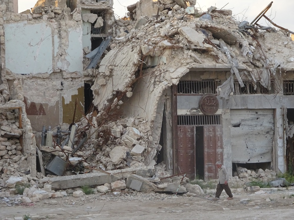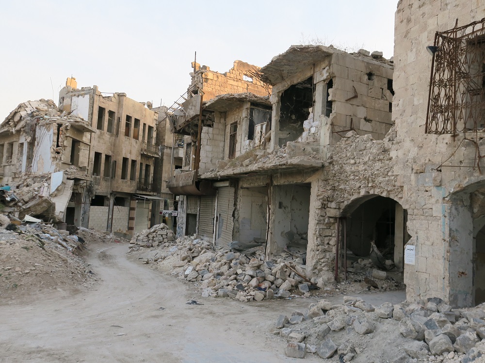 Wir steigen auf das Dach des Altenheims im Zentrum von Aleppo. Vor uns breitet sich eine Ruinenlandschaft aus. Diese Eindrücke vertiefen wir dann noch bei einem "Spaziergang" durch die Gassen. Totale Zerstörung. Niemand kann in diesem Winkel der Stadt mehr leben.