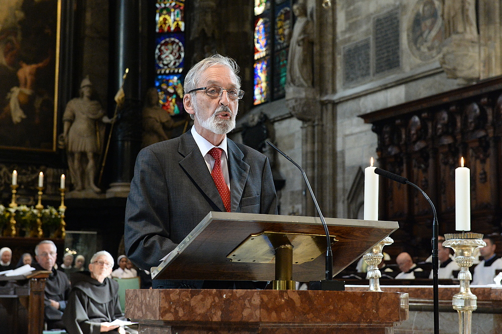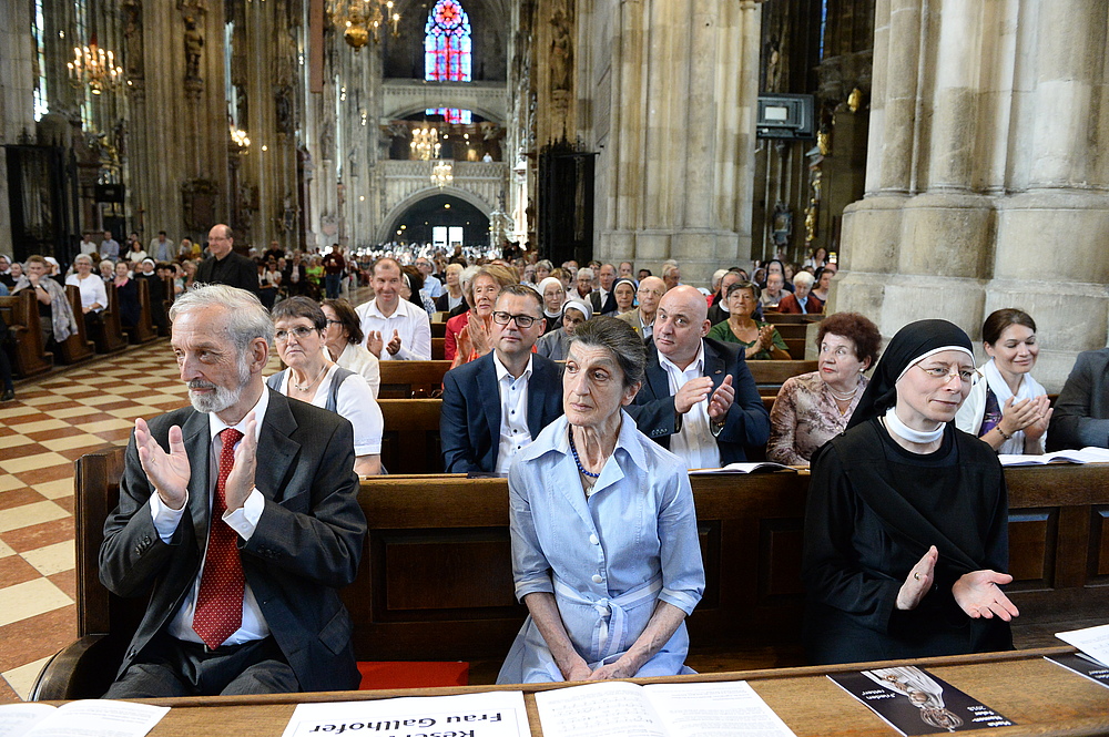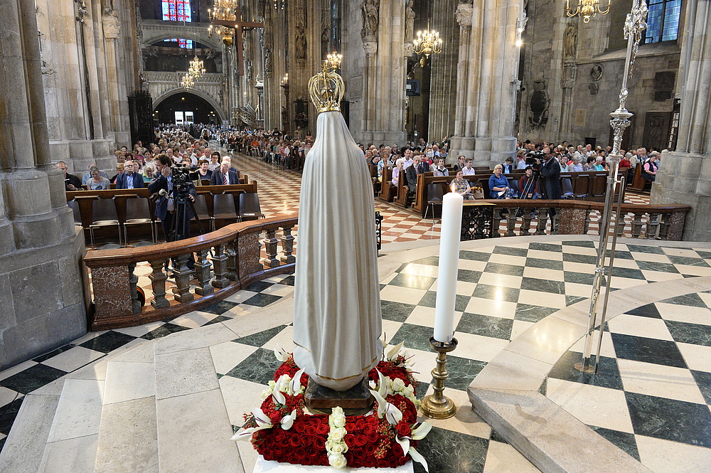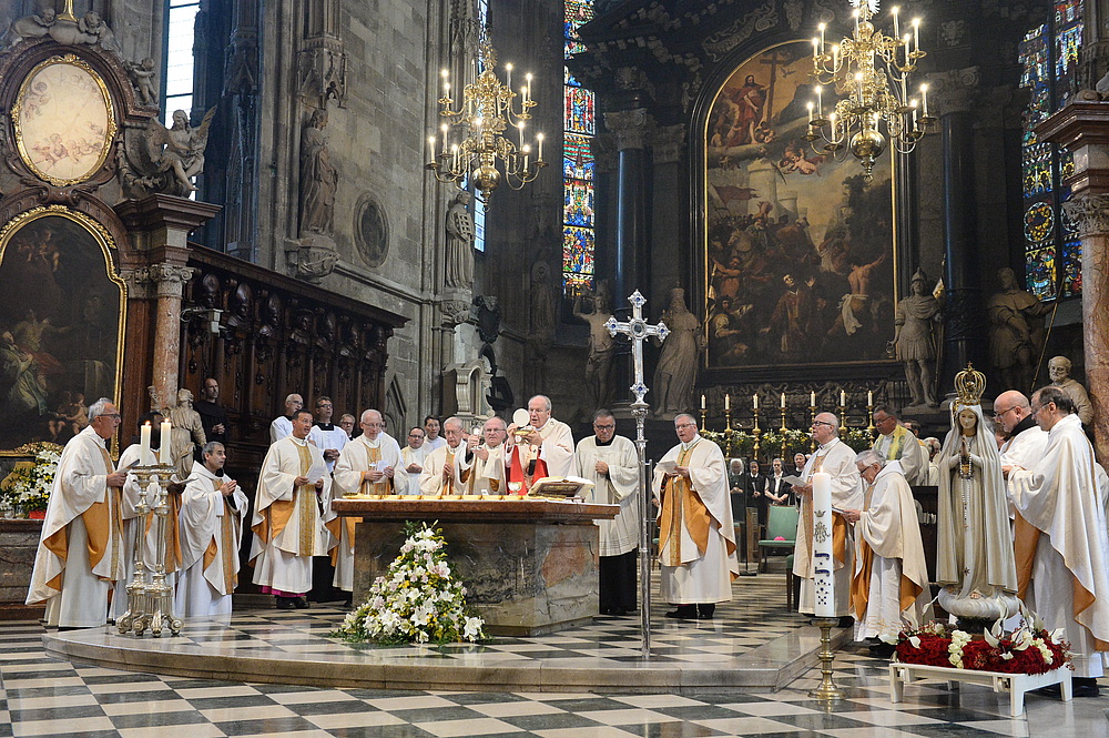 Wie auch bei der Maria-Namen-Feier am Samstag, der der Salzburger Erzbischof Franz Lackner vorgestanden war, begrüßte eingangs der geistliche Leiter der Rosenkranz-Sühnekreuzzug-Gebetsgemeinschaft, Pater Benno Mikocki, die zahlreichen Gläubigen im vollen Stephansdom. In einem Grußwort von Papst Franziskus an die Gläubigen, das verlesen wurde, bekundete der Papst seine innere Teilnahme am Gebet für den Frieden. "Kämpfen wir auch mit den geistlichen Waffen des Gebets und der Sühne", so Papst Franziskus in der von Kardinalstaatssekretär Pietro Parolin gezeichneten Botschaft, die mit dem apostolischen Segen für die Mitfeiernden schloss. Das persönliche Glaubenszeugnis im ersten Teil der Maria-Namen-Feier hielt wieder der Publizist Prof. Heinz Nussbaumer. Abgeschlossen wurde der erste Teil der Feier mit dem gemeinsamen Rosenkranzgebet, bevor die Festmesse begann.