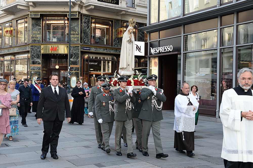 Im Anschluss an den Gottesdienst führte unter dem Geläut der Pummerin eine feierliche Prozession die Teilnehmer der Maria-Namen-Feier über Graben, Kohlmarkt und Michaelerplatz in den inneren Burghof. Der Prozession stand Militärbischof Freistetter vor, der im Burghof den Abschlussegen erteilte.