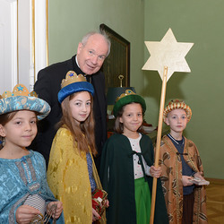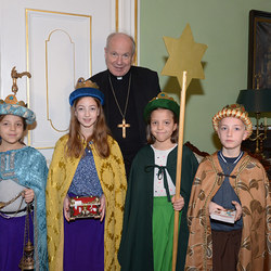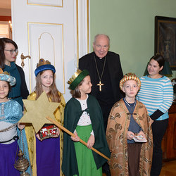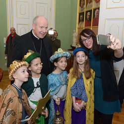 Sternsinger/innen aus der Wiener Pfarre Maria Dreikirchen besuchen Kardinal Christoph Schönborn.