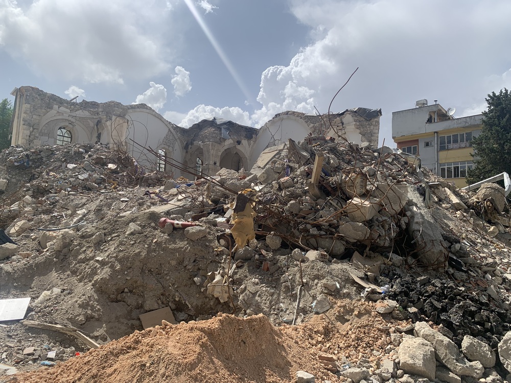 Erzbischof Grigorios vor seiner zerstörten Kirche in Adiyaman.