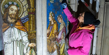 Verschmutzung der 130 Jahre alten Kunstwerke verdeckt deren ursprüngliche Farbbrillanz - Reinigung laut Restaurierkonzept in Abstimmung mit dem Bundesdenkmalamt