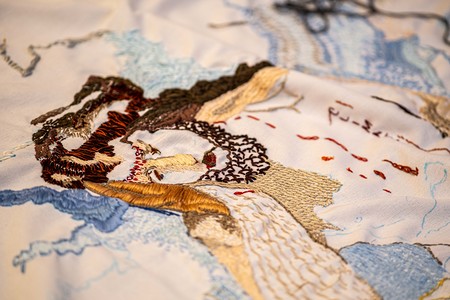 Auch im Advent lädt die Künstlerin Cécile Belmont Interessierte ein, gemeinsam an einem Fastentuch zu arbeiten, das ab Aschermittwoch 2023 in der Kapelle im Linzer Bischofshof zu sehen sein wird