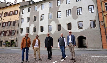 Lang geplante Sanierung abgeschlossen, künstlerische Fassadengestaltung von Martin Walde ermöglicht laut Bischof Hermann Glettler verschiedene tiefsinnige Deutungsmöglichkeiten