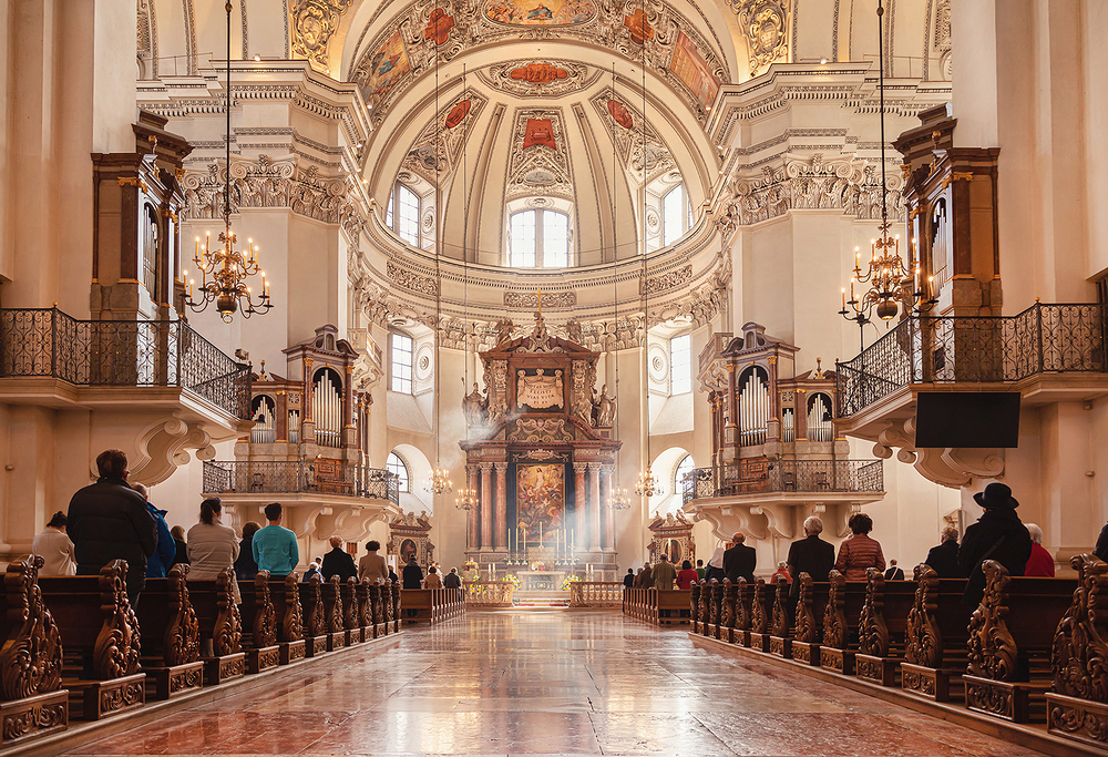Der Dom von Salzburg beherrscht mit seiner markanten, zweitürmigen Fassade und dem mächtigen Baukörper das Bild der Altstadt von Salzburg. Die barocken Plätze, die ihn umgeben, formen eine einzigartige Bühne, die von den Festspielen genutzt und von der UNESCO als Weltkulturerbe gewürdigt wird. Der Grundstein des bestehenden, barocken Domes wurde 1614 gelegt. 1628 wurde der Dom geweiht, doch erst rund vierzig Jahre später waren die Türme und auch die umgebenden Plätze vollendet. Der barocke Bau beeindruckt durch seine klaren Formen, den einheitlichen Dekor und die leuchtende Fassade aus heimischem Marmor. Sein Architekt, Santino Solari, schuf den bedeutendsten Kirchenbau jener Zeit nördlich der Alpen, der die Architektur in ganz Österreich und Süddeutschland beeinflussen wird.