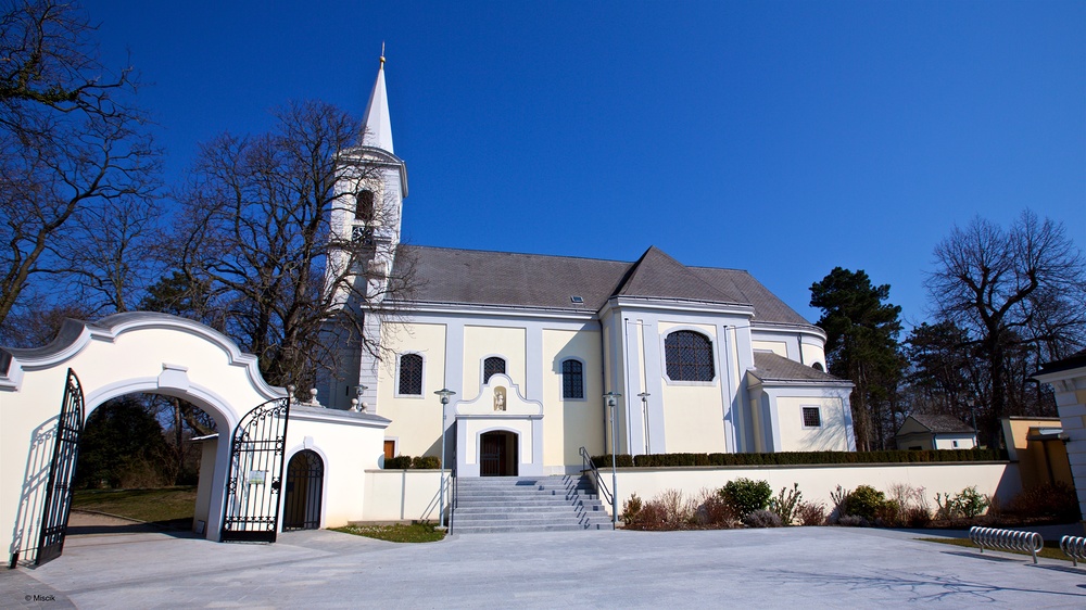 Die Pfarrkirche zum heiligen Josef wurde im Jahr 1714 erbaut. Den Hochaltar ziert eine überlebensgroße Statue des heiligen Josef, der als sorgender Nährvater und väterlicher Beschützer das Jesuskind auf dem Arm trägt. Seit 300 Jahren steht die Pfarrkirche im Schnittpunkt vom Schlosspark mit dem ehemaligen Jagdschloss Maria Theresias und der ca. 2000 Einwohner zählenden Ortschaft.