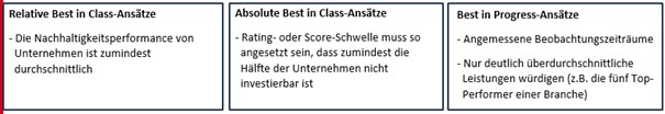 Ein Best-in-Class-Ansatz, der eine Kompensation von einzelnen nicht nachhaltigen Titeln durch sehr nachhaltige Titel zulässt und nur dadurch eine mehr als durchschnittliche Nachhaltigkeits-performance erreicht, entspricht nicht dem Anspruch dieser Richtlinie.